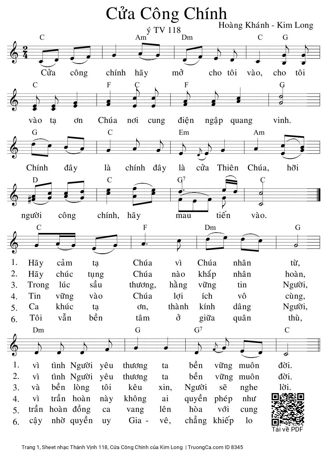 The Videos/audios Thánh Vịnh 118, Cửa Công Chính by Kim Long were embed from Youtube, Musescore or the other 3rd links. Videos are subject to 3rd's copyright control and may be removed by YouTube's copyright rules and 3rd's policies or maybe included advertisements. If you cannot access to these songs, this mean that have been removed.
