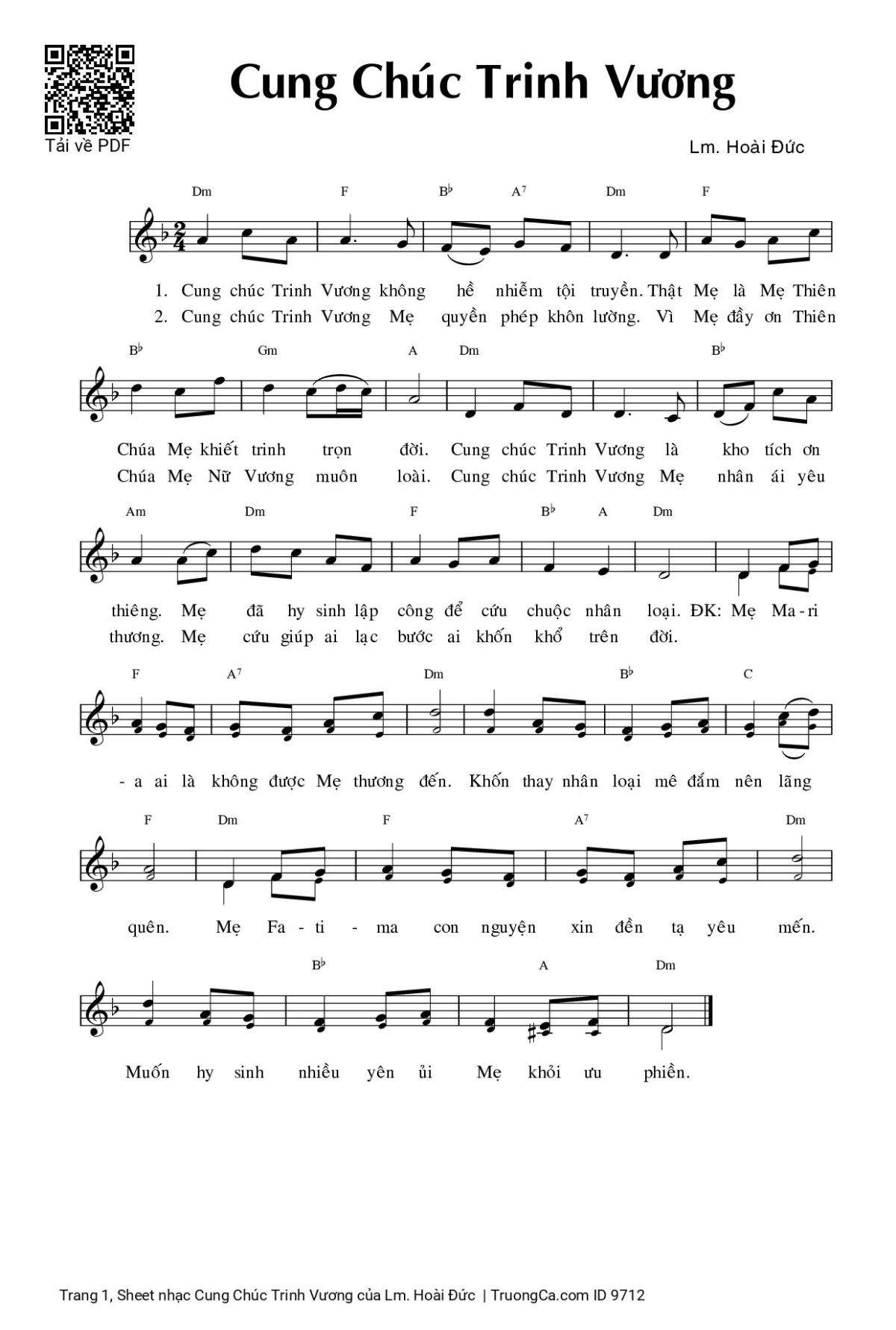 2. Cung chúc Trinh Vương Mẹ quyền phép khôn lường. Vì Mẹ đầy ơn Thiên Chúa Mẹ Nữ Vương muôn loài. Cung chúc Trinh Vương Mẹ nhân ái yêu thương. Mẹ cứu giúp ai lạc bước ai khốn khổ trên đời.