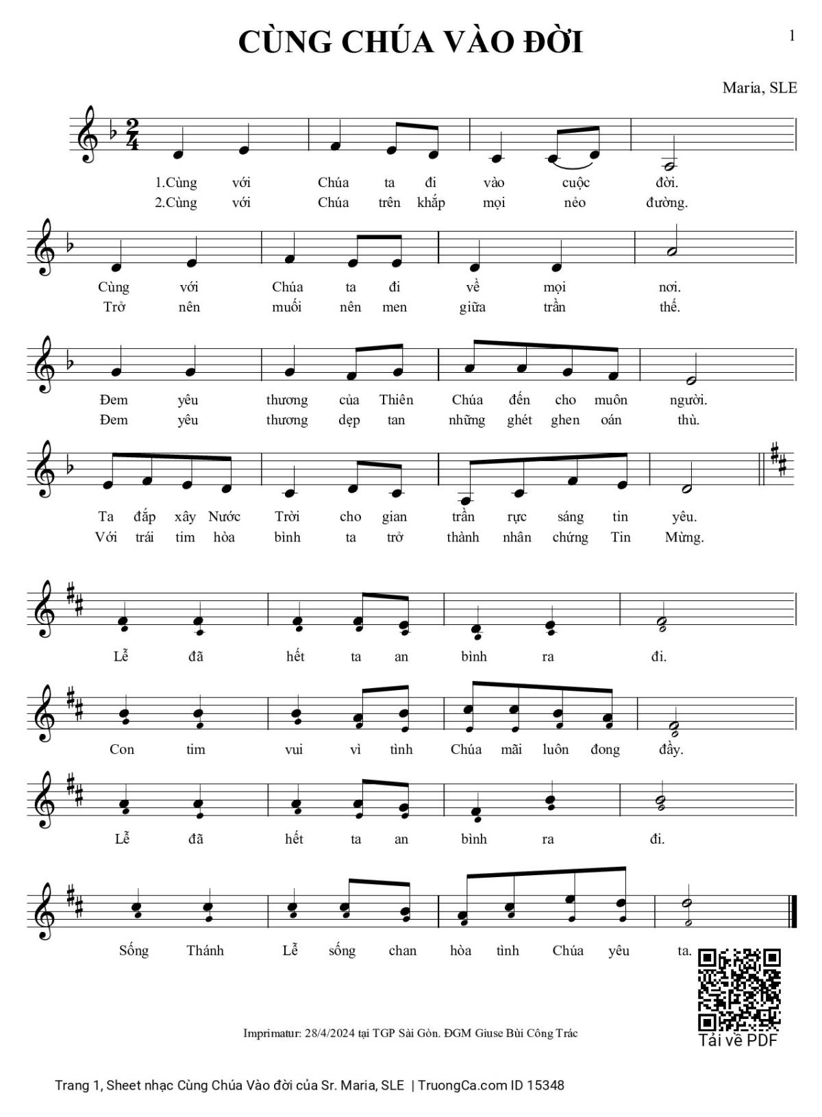 1. Cùng với Chúa ta đi vào cuộc đời, cùng với Chúa ta đi về mọi nơi. Đem yêu thương của Thiên Chúa đến cho muôn người, ta đắp xây Nước Trời cho gian trần rực sáng tin yêu.