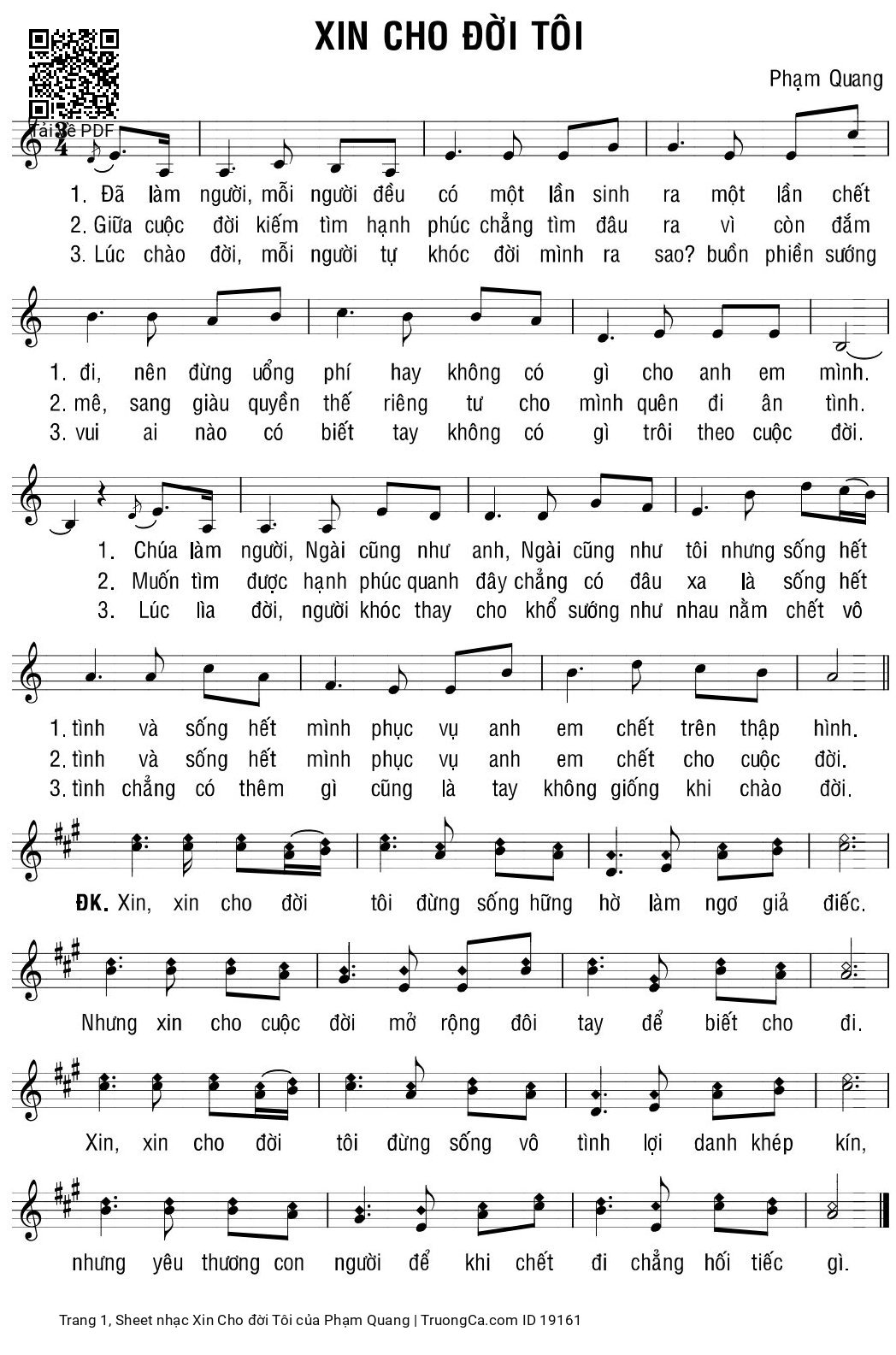 Điệp khúc. Xin, xin cho đời tôi đừng sống hững hờ làm ngơ giả điếc. Nhưng xin cho cuộc đời mở rộng đôi tay để biết cho đi. Xin, xin cho đời tôi đừng sống vô tình, lợi danh khép kín, nhưng yêu thương con người để khi chết đi chẳng hối tiếc gì.