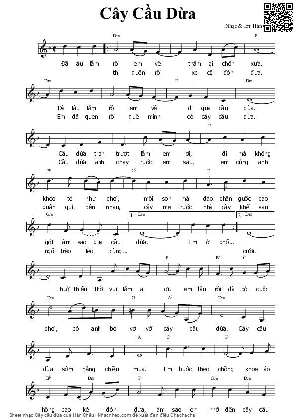 Transposition is the process of moving a song's melody and chords up or down in pitch by a constant interval. The direction of the transposition tool is indicated by a plus (+) sign for up and a minus (-) sign for down. Hover mouse over chords signs to see the chords chart of Cây cầu dừa song.