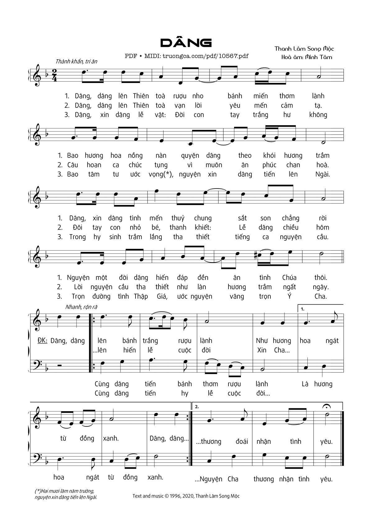 1. Dâng dâng lên Thiên toà rượu nho bánh miến thơm lành. Bao hương hoa nồng nàn quyện dâng theo khói hương trầm. Dâng xin dâng tình mến thuỷ chung sắt son chẳng rời. Nguyện một đời dâng hiến đáp đền ân tình Chúa thôi.