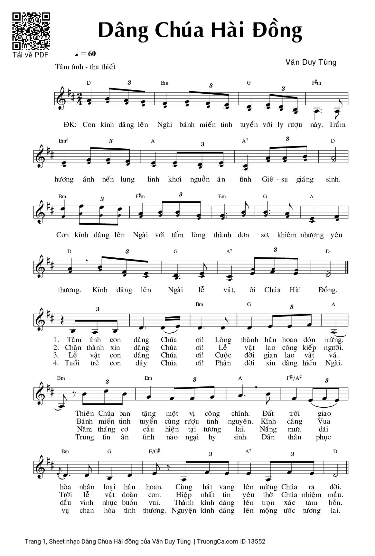 Transposition is the process of moving a song's melody and chords up or down in pitch by a constant interval. The direction of the transposition tool is indicated by a plus (+) sign for up and a minus (-) sign for down. Hover mouse over chords signs to see the chords chart of Dâng Chúa Hài đồng song.