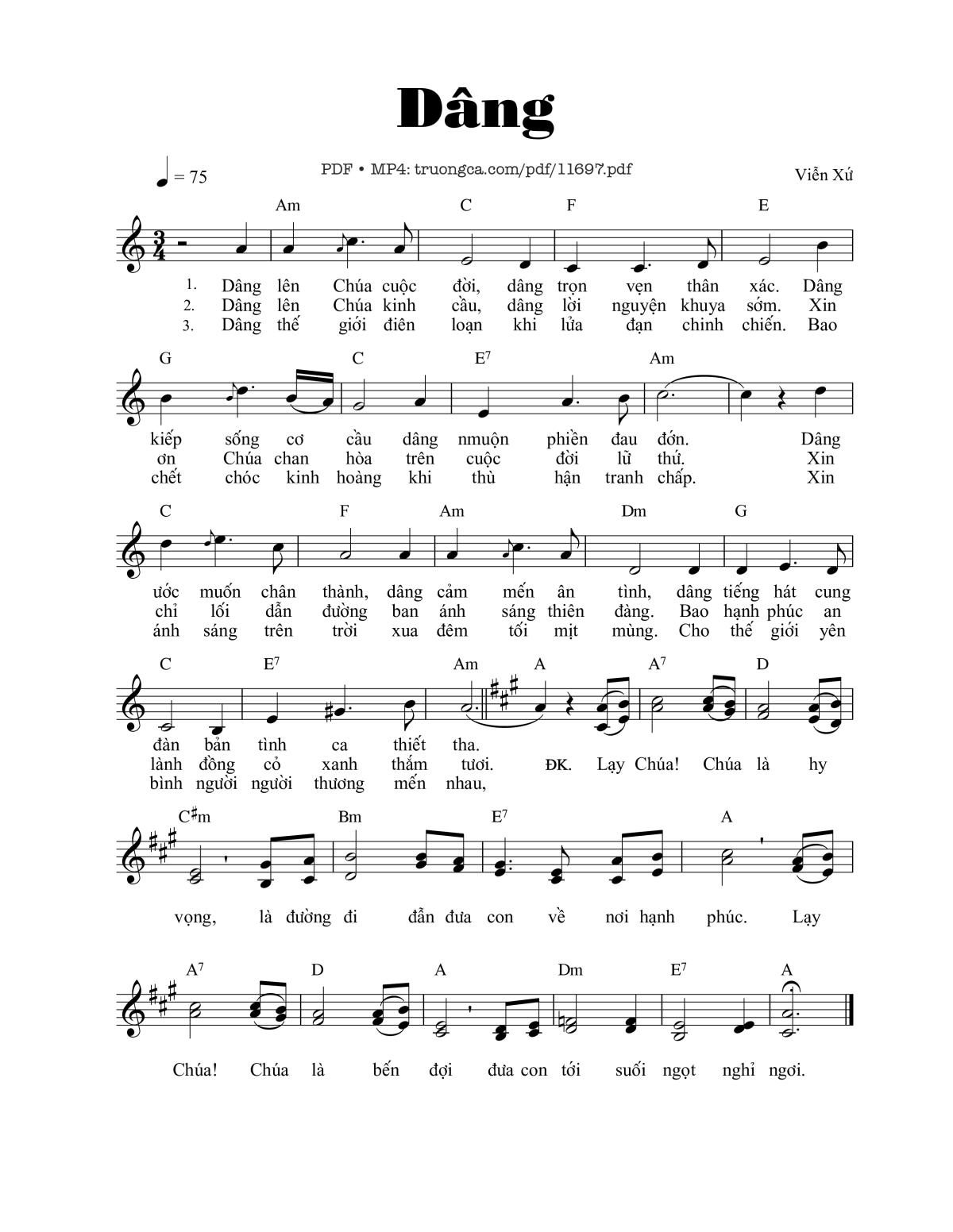 Transposition is the process of moving a song's melody and chords up or down in pitch by a constant interval. The direction of the transposition tool is indicated by a plus (+) sign for up and a minus (-) sign for down. Hover mouse over chords signs to see the chords chart of Dâng song.