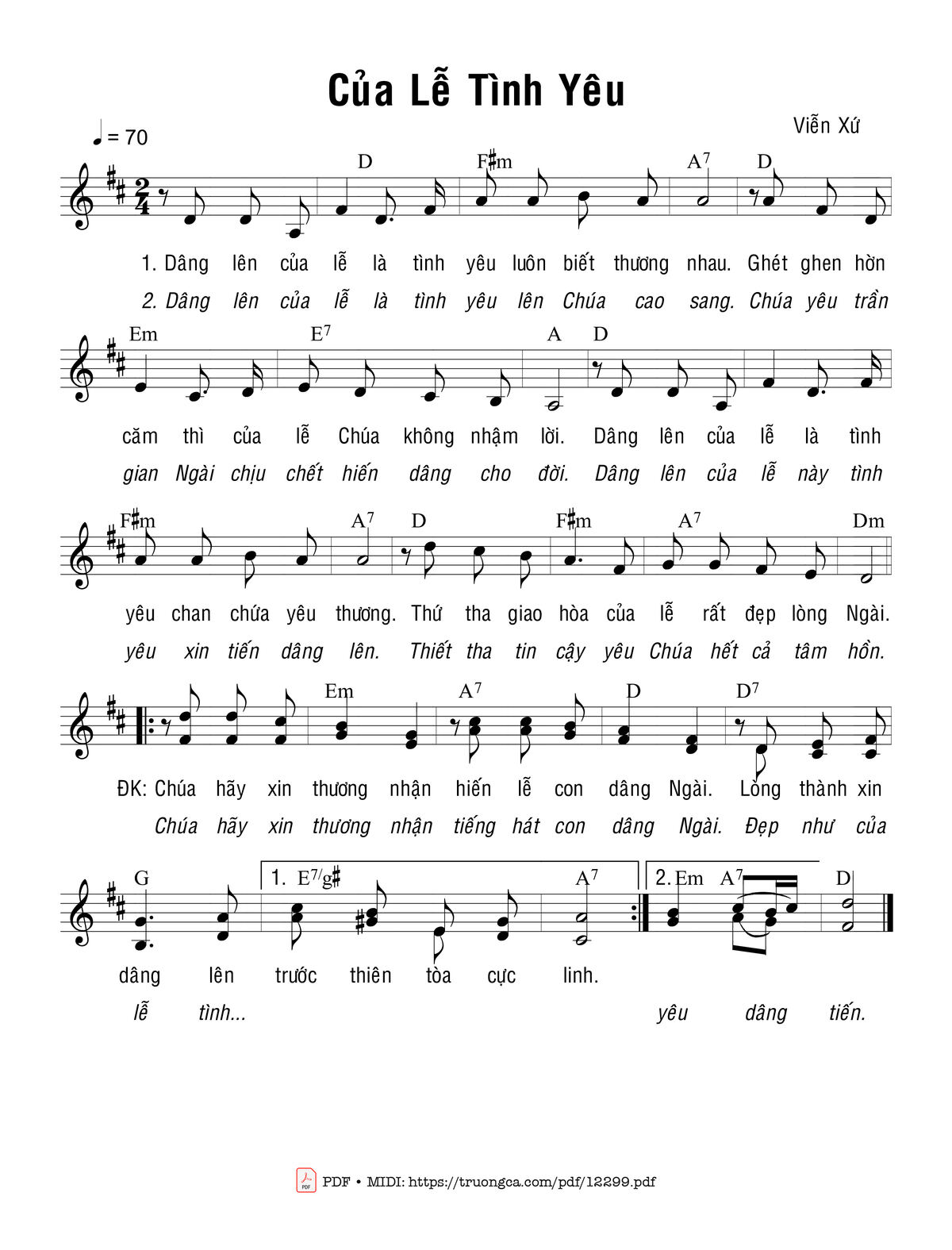 2. Dâng lên của lễ là tình yêu lên Chúa cao sang. Chúa yêu trần gian, Ngài chịu chết hiến dâng cho đời. Dâng lên của lễ này tình yêu xin tiến dâng lên. Thiết tha tin cậy yêu Chúa hết cả tâm hồn.