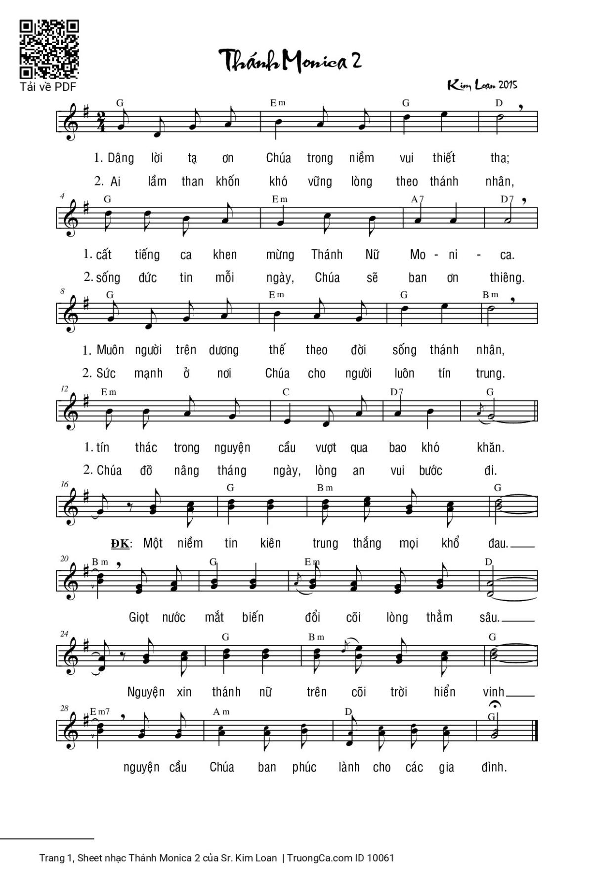 1/ Dâng lời tạ ơn Chúa trong niềm vui thiết tha, cất tiếng ca khen mừng thánh nữ Monica, muôn người trên dương thế theo đời sống thánh nhân, tín thác trong nguyện cầu vượt qua bao khó khăn.