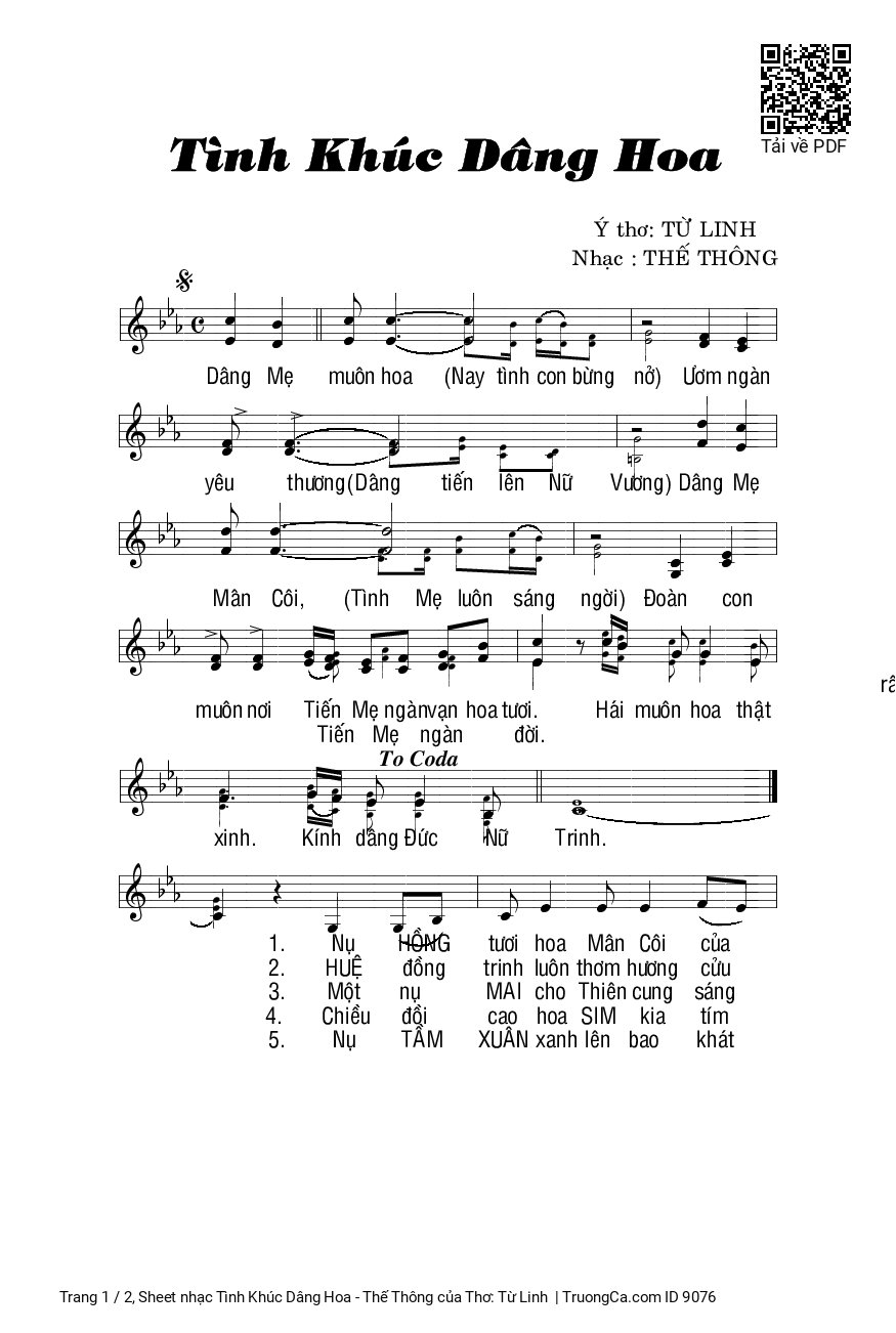 Điệp khúc. Dâng Mẹ muôn hoa (Nay tình con bừng nở) Ươm ngàn yêu thương (Dâng tiến lên Nữ Vương) Dâng Mẹ Mân Côi (Tình Mẹ luôn sáng ngời) Đoàn con muôn nơi. Tiến Mẹ ngàn vạn hoa tươi. Hái muôn hoa thật xinh. Kính dâng Đức Nữ Trinh.