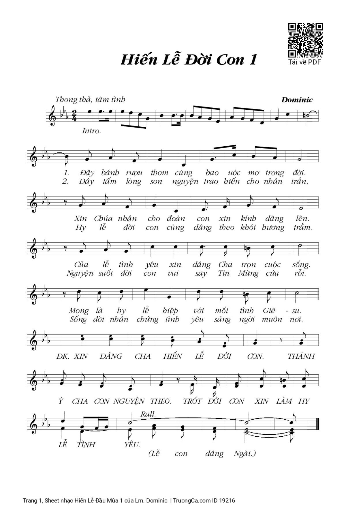 Điệp khúc. Xin dâng Cha hiến lễ đời con. Thánh ý Cha con nguyện theo. Trót đời con xin làm hy lễ tình yêu. (lễ con dâng Ngài).