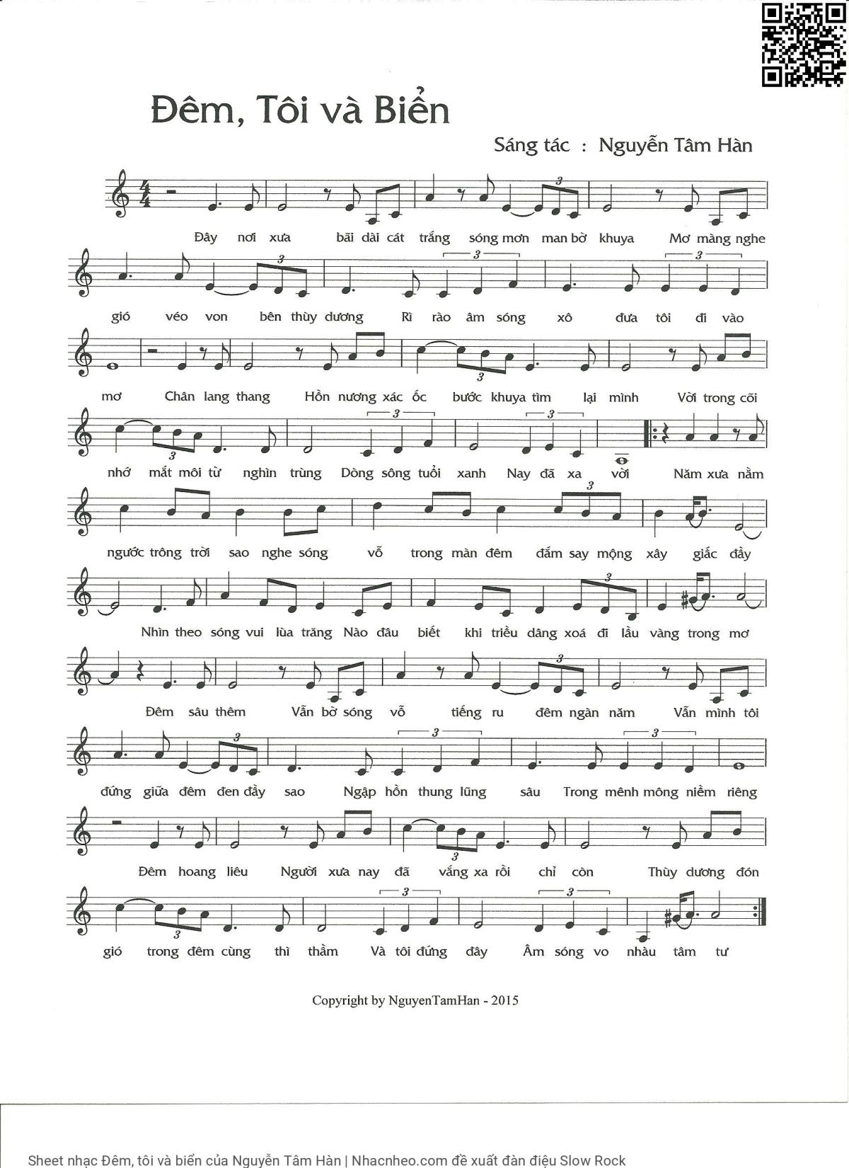 Transposition is the process of moving a song's melody and chords up or down in pitch by a constant interval. The direction of the transposition tool is indicated by a plus (+) sign for up and a minus (-) sign for down. Hover mouse over chords signs to see the chords chart of Đêm, tôi và biển song.
