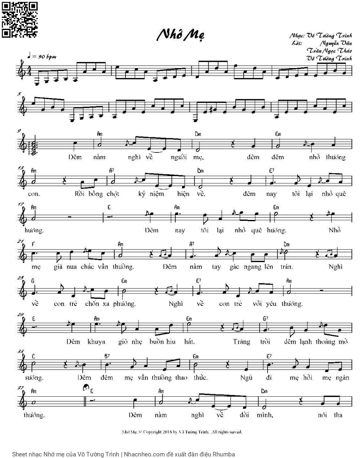 Transposition is the process of moving a song's melody and chords up or down in pitch by a constant interval. The direction of the transposition tool is indicated by a plus (+) sign for up and a minus (-) sign for down. Hover mouse over chords signs to see the chords chart of Nhớ mẹ song.