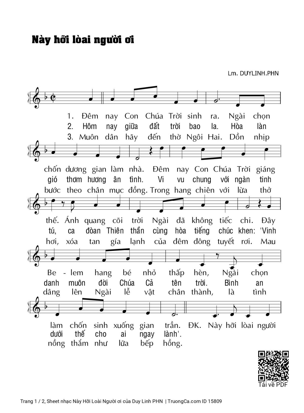 Điệp khúc. Này hỡi loài người ơi. Hãy dâng lời hát ca mừng Chúa ta nay đã sinh ra. Chúa đến cứu nhân loại. Và ban cho niềm vui mới. Hãy mở lòng đón nhận Hồng Ân.