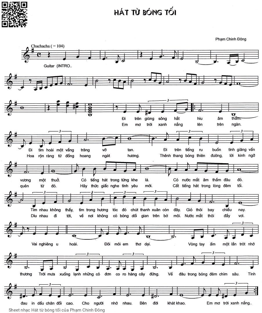 Transposition is the process of moving a song's melody and chords up or down in pitch by a constant interval. The direction of the transposition tool is indicated by a plus (+) sign for up and a minus (-) sign for down. Hover mouse over chords signs to see the chords chart of Hát từ bóng tối song.