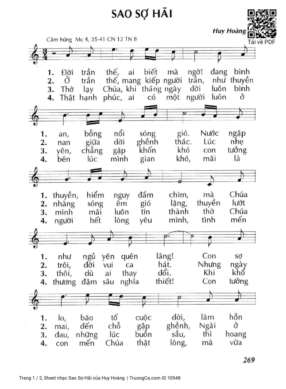 Điệp khúc: Sao sợ lo, không tin thật lòng, Thầy ở bên, sao còn sợ hãi, sao nghi ngờ tình Chúa yêu thương. Bước đường con Chúa đếm cả rồi, Chúa giữ gìn từng sợi tóc mềm, Ngài theo con từng bước chân đi, sao con còn sợ hãi làm gì?