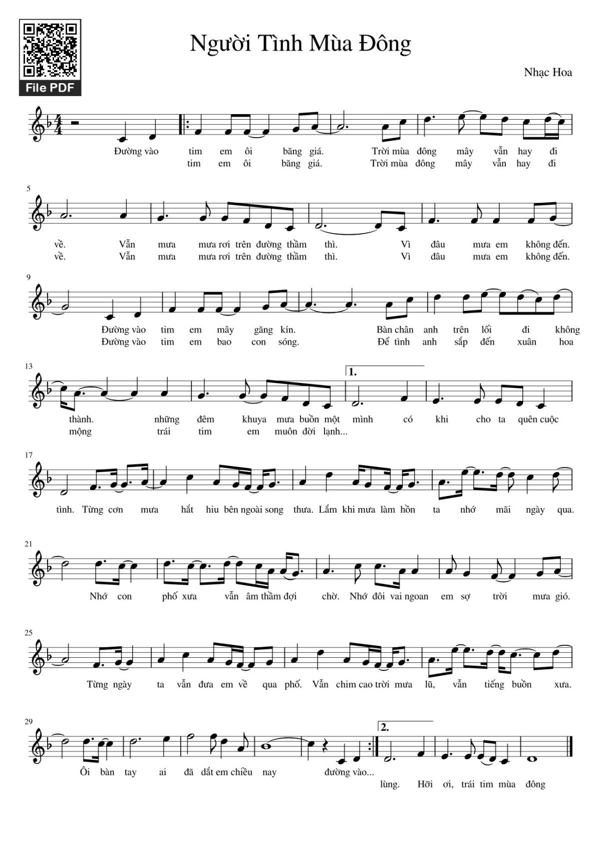 Sheet music Người Tình Mùa Đông by Nhạc Ngoại and PDF file was posted here to support you to practice singing perfectly. Sheets with notes and chords are for reference only, for non-commercial purposes only, not involved with earning money by buying and selling. Copyright is belong to song writer/author and copyright owner. Truongca.com do not own any copyrighted content. You can download the high-quality PDF files which contain staffs by PDF link above.