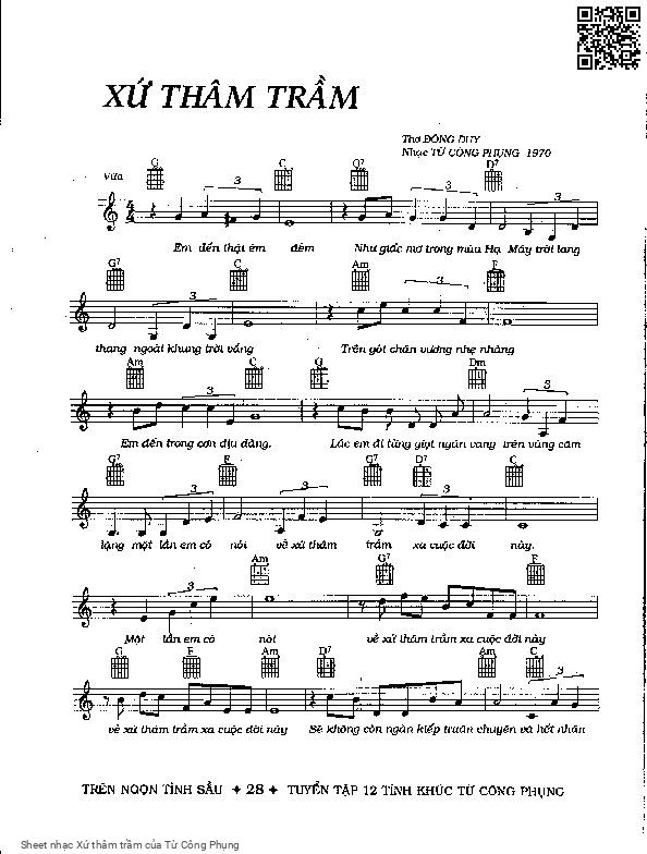 Transposition is the process of moving a song's melody and chords up or down in pitch by a constant interval. The direction of the transposition tool is indicated by a plus (+) sign for up and a minus (-) sign for down. Hover mouse over chords signs to see the chords chart of Xứ thâm trầm song.