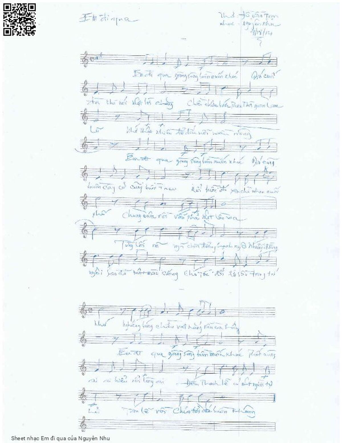 Nguyên Nhu Em đi qua dòng sông buồn muốn khóc Gió cuối đời khẽ nói một lời chăng [PDF] [Sheet] [Lyrics] [Mp4/Midi]