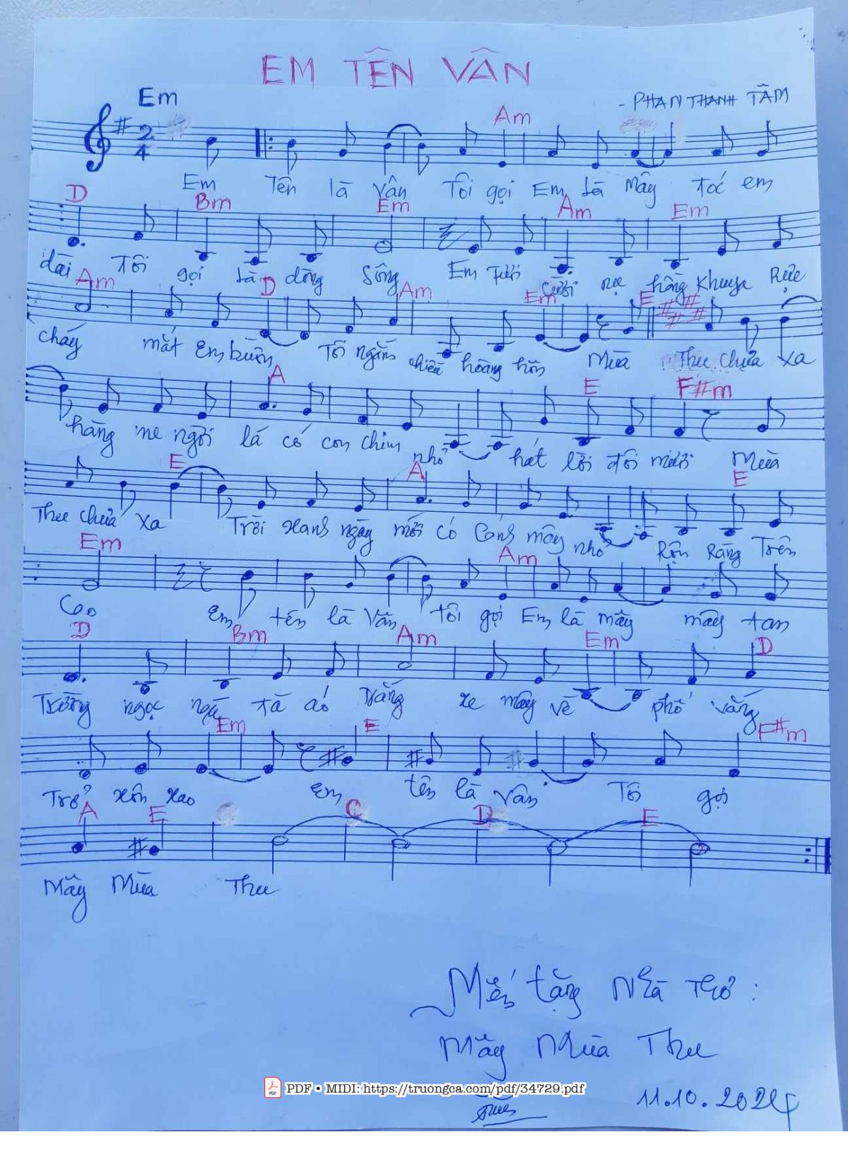 Phan Thanh Tâm Em tên là Vân tôi gọi em là Mây Tóc em dài [PDF] [Sheet] [Lyrics] [Mp4/Midi]