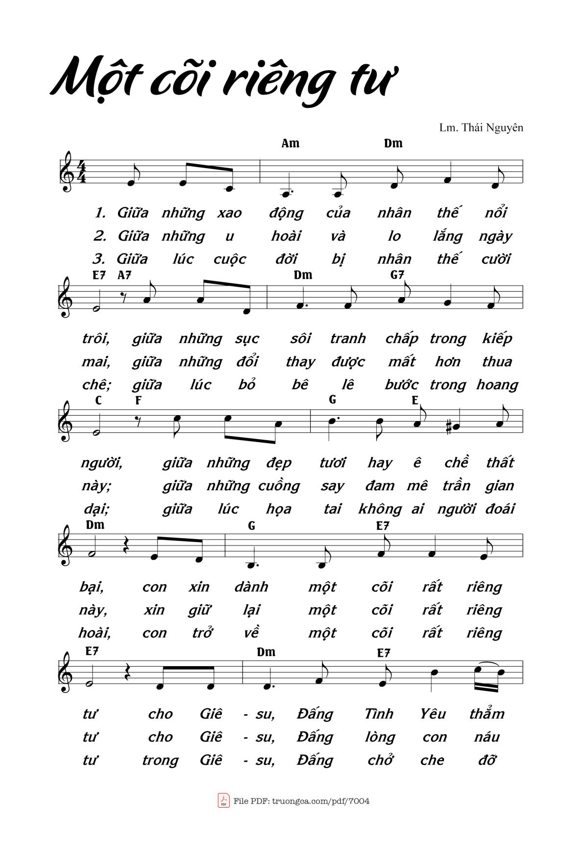 The Videos/audios Một cõi riêng tư by Lm. Thái Nguyên were embed from Youtube, Musescore or the other 3rd links. Videos are subject to 3rd's copyright control and may be removed by YouTube's copyright rules and 3rd's policies or maybe included advertisements. If you cannot access to these songs, this mean that have been removed.