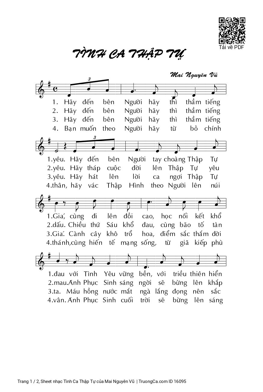 Transposition is the process of moving a song's melody and chords up or down in pitch by a constant interval. The direction of the transposition tool is indicated by a plus (+) sign for up and a minus (-) sign for down. Hover mouse over chords signs to see the chords chart of Tình Ca Thập Tự song.