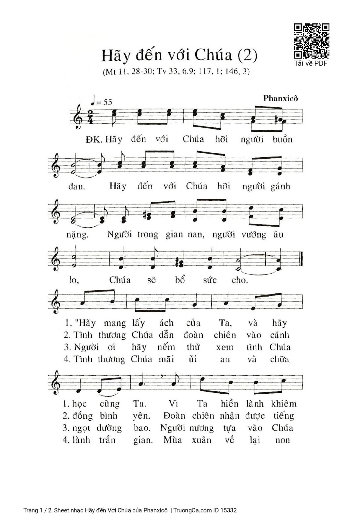 Điệp khúc. Hãy đến với Chúa hỡi người buồn đau. Hãy đến với Chúa hỡi người gánh nặng. Người trong gian nan, người vướng âu lo, Chúa sẽ bổ sức cho.