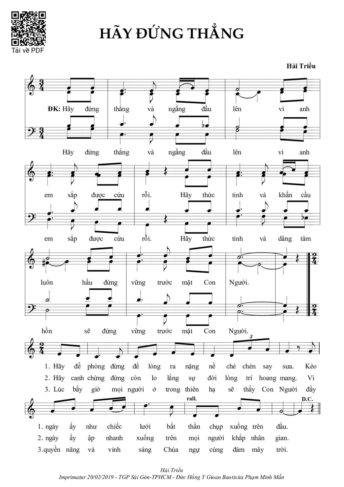 Điệp khúc. Hãy đứng thẳng và ngẩng đầu lên vì anh em sắp được cứu rỗi. Hãy thức tỉnh và khẩn cầu luôn, hầu đứng vững trước mặt Con Người.