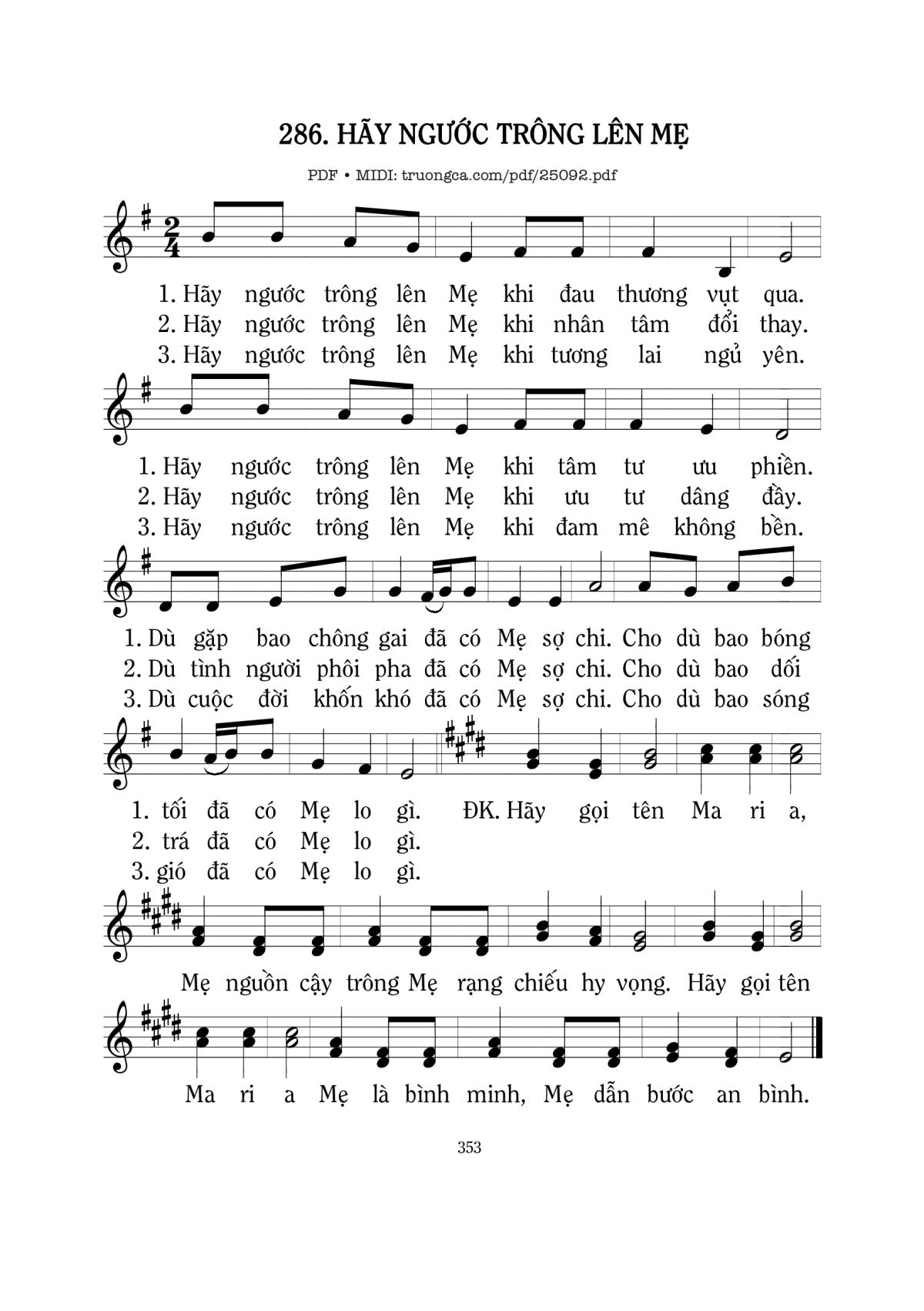 1- Hãy ngươc trông lên Mẹ khi đau thương vụt qua. Hãy ngước trông lên Mẹ khi tâm tư ưu phiền. Dù gặp bao chông gai đã có Mẹ sợ chi. Cho dù bao bóng tối đã có Mẹ lo gì.