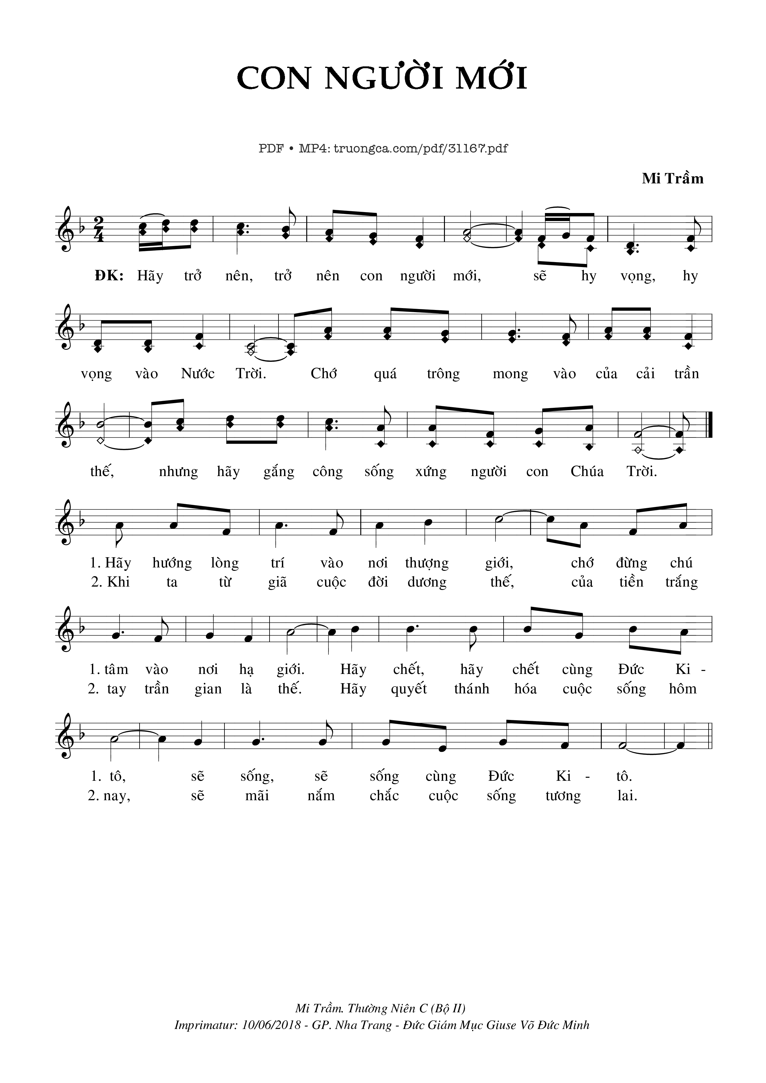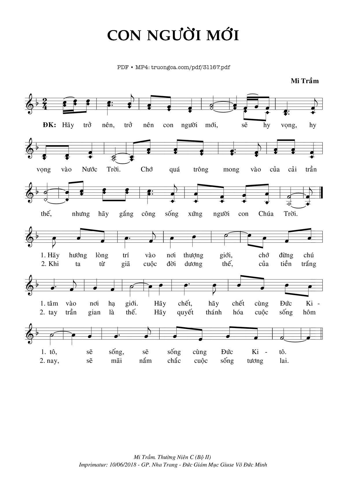 Transposition is the process of moving a song's melody and chords up or down in pitch by a constant interval. The direction of the transposition tool is indicated by a plus (+) sign for up and a minus (-) sign for down. Hover mouse over chords signs to see the chords chart of Con Người Mới song.