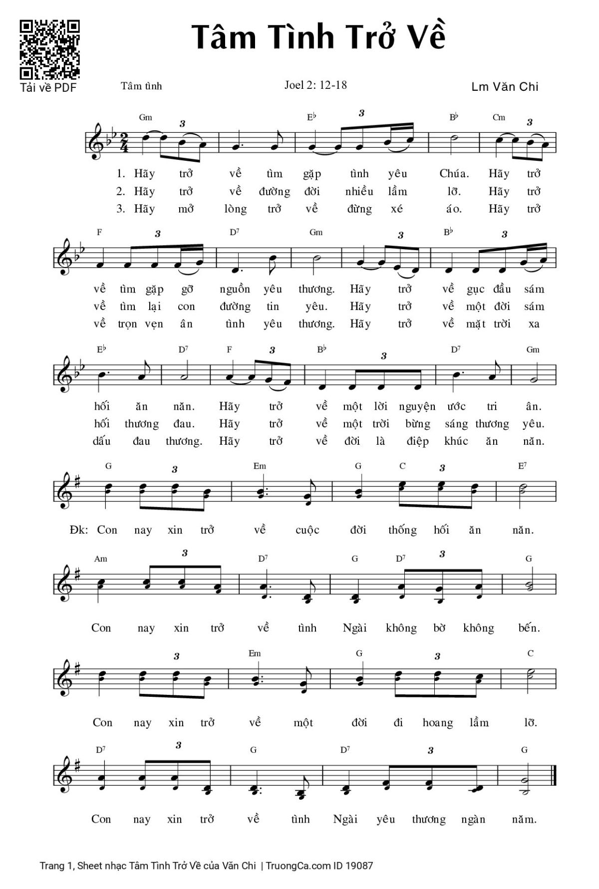 Transposition is the process of moving a song's melody and chords up or down in pitch by a constant interval. The direction of the transposition tool is indicated by a plus (+) sign for up and a minus (-) sign for down. Hover mouse over chords signs to see the chords chart of Tâm Tình Trở Về song.