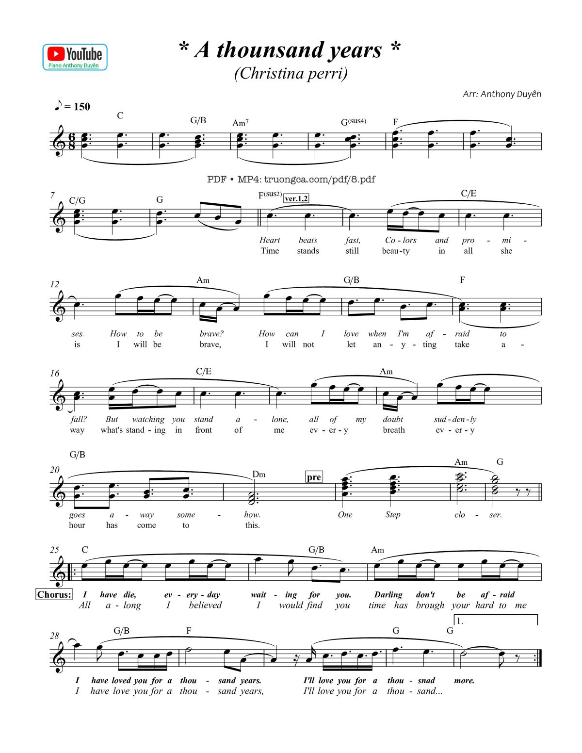 The Videos/audios A thousand years by Christina Perri were embed from Youtube, Musescore or the other 3rd links. Videos are subject to 3rd's copyright control and may be removed by YouTube's copyright rules and 3rd's policies or maybe included advertisements. If you cannot access to these songs, this mean that have been removed.