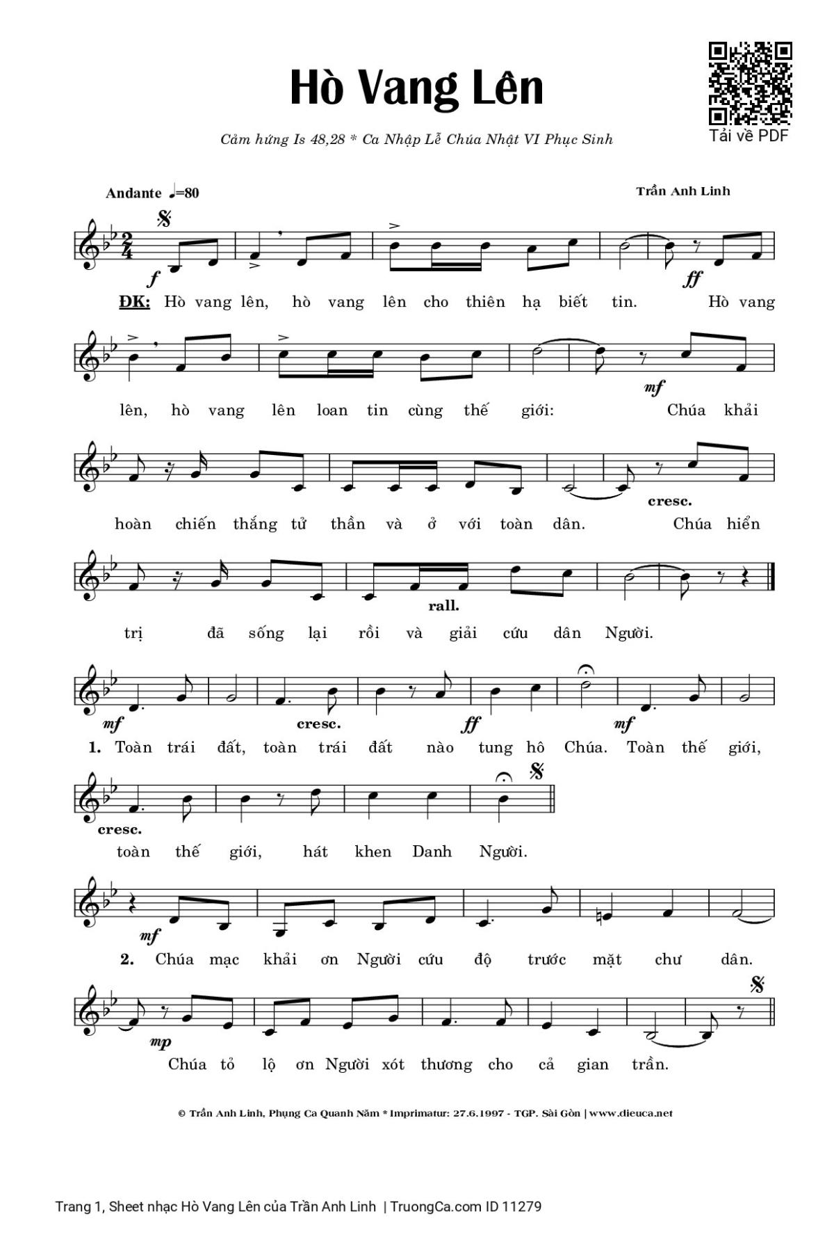 Điệp khúc: Hò vang lên, hò vang lên cho thiên hạ biết tin. Hò vang lên, hò vang lên loan tin cùng thế giới: Chúa khải hoàn chiến thắng tử thần và ở với toàn dân. Chúa hiển trị đã sống lại rồi và giải cứu dân Người.