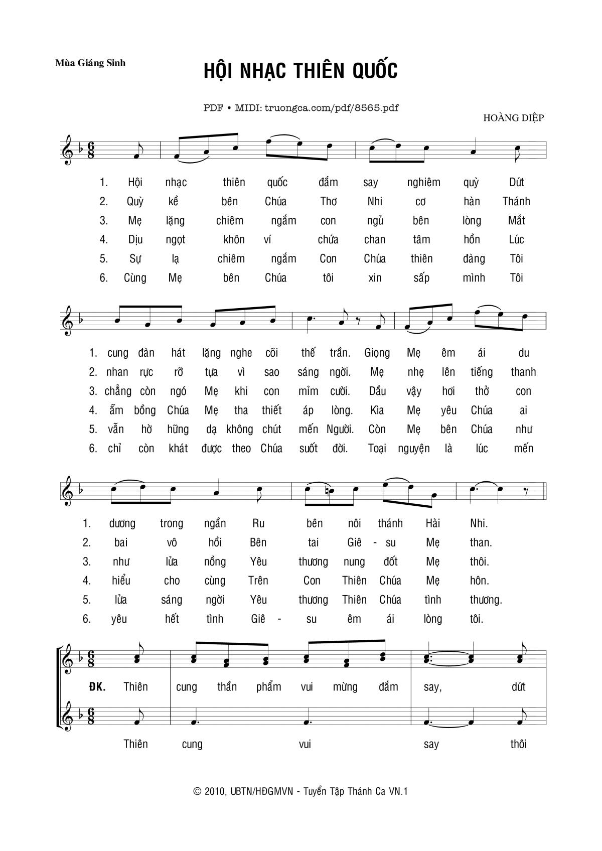 The Videos/audios Hội Nhạc Thiên Quốc by Lời Việt: Hoàng Diệp were embed from Youtube, Musescore or the other 3rd links. Videos are subject to 3rd's copyright control and may be removed by YouTube's copyright rules and 3rd's policies or maybe included advertisements. If you cannot access to these songs, this mean that have been removed.