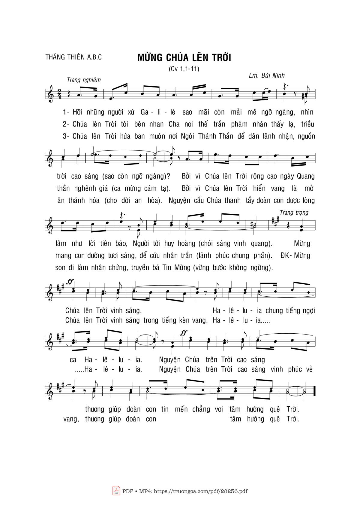 Điệp khúc. Mừng Chúa lên Trời vinh sáng trong tiếng kèn vang. Ha-le-lu-ia chúng tiếng ngợi ca Ha-le-lu-ia. Nguyện Chúa trên Trời cao sáng vinh phúc vẻ vang, thương giúp đoàn con tin mến chẳng vơi tâm hướng quê Trời.