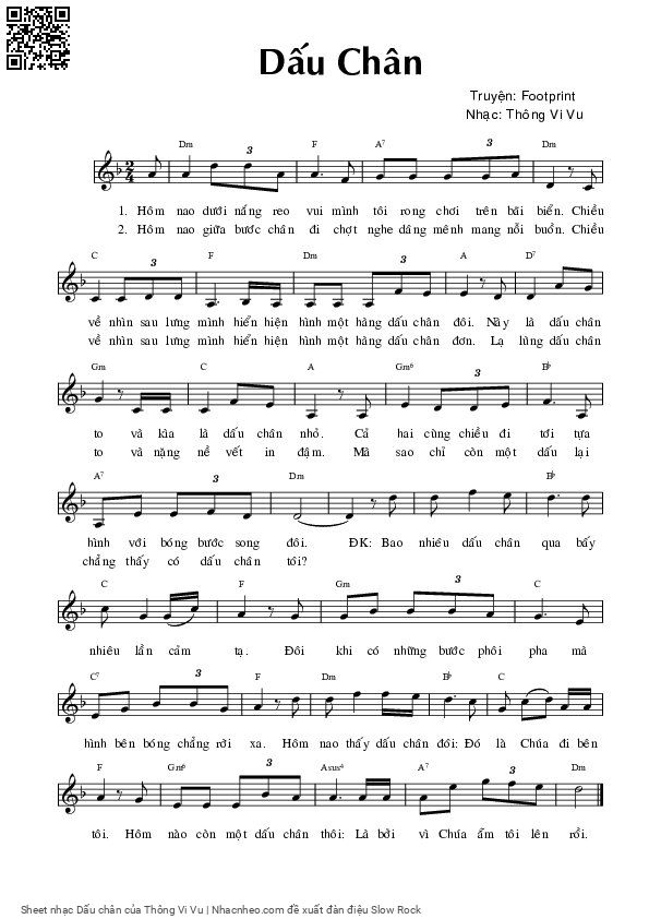 Transposition is the process of moving a song's melody and chords up or down in pitch by a constant interval. The direction of the transposition tool is indicated by a plus (+) sign for up and a minus (-) sign for down. Hover mouse over chords signs to see the chords chart of Dấu chân song.