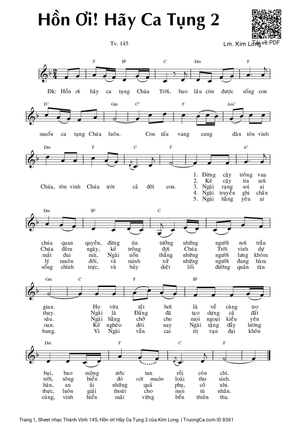 Transposition is the process of moving a song's melody and chords up or down in pitch by a constant interval. The direction of the transposition tool is indicated by a plus (+) sign for up and a minus (-) sign for down. Hover mouse over chords signs to see the chords chart of Thánh Vịnh 145, Hồn ơi! Hãy Ca Tụng 2 song.