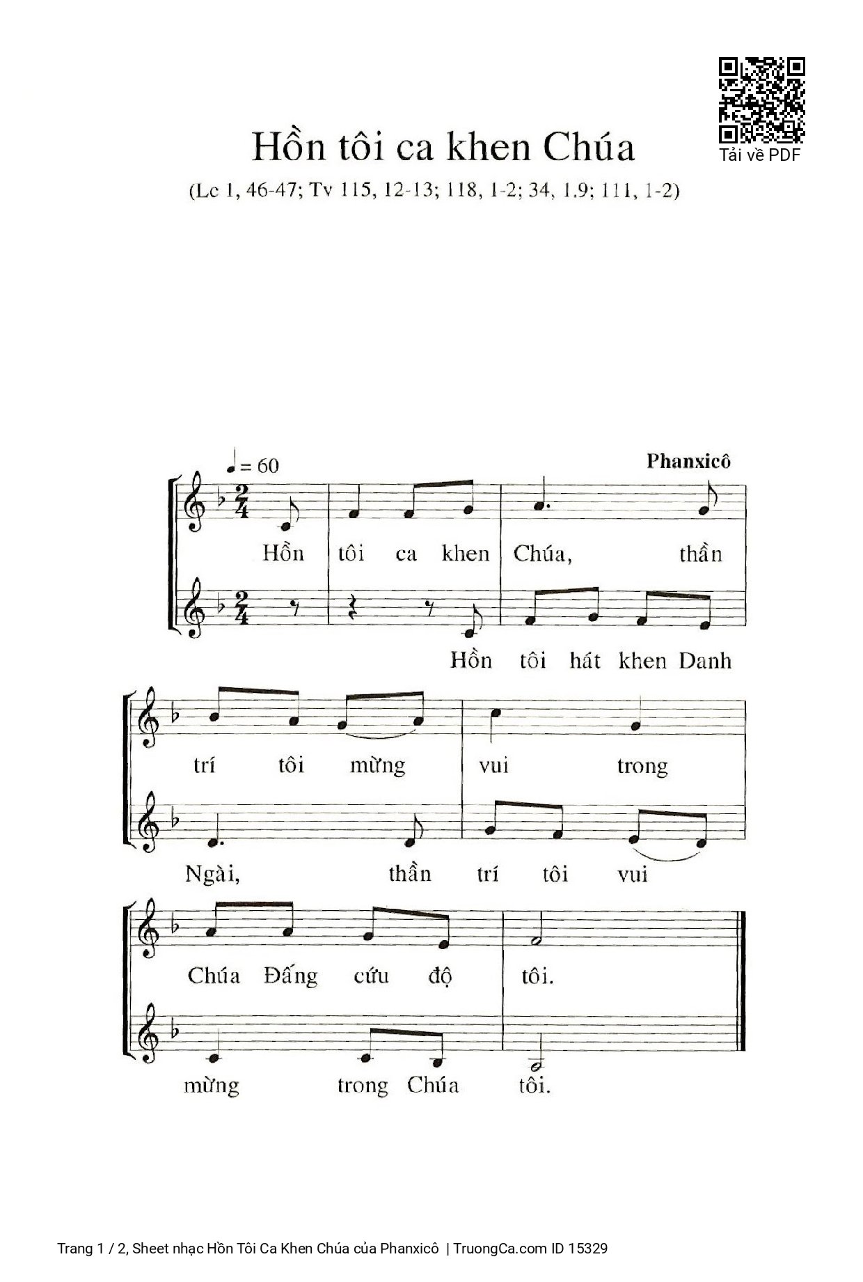 Điệp khúc. Hồn tôi ca khen Chúa, (Hồn tôi hát khen Danh Ngài,) thần trí tôi mừng vui trong Chúa Đấng cứu độ tôi. (thần trí tôi vui mừng trong Chúa tôi.)