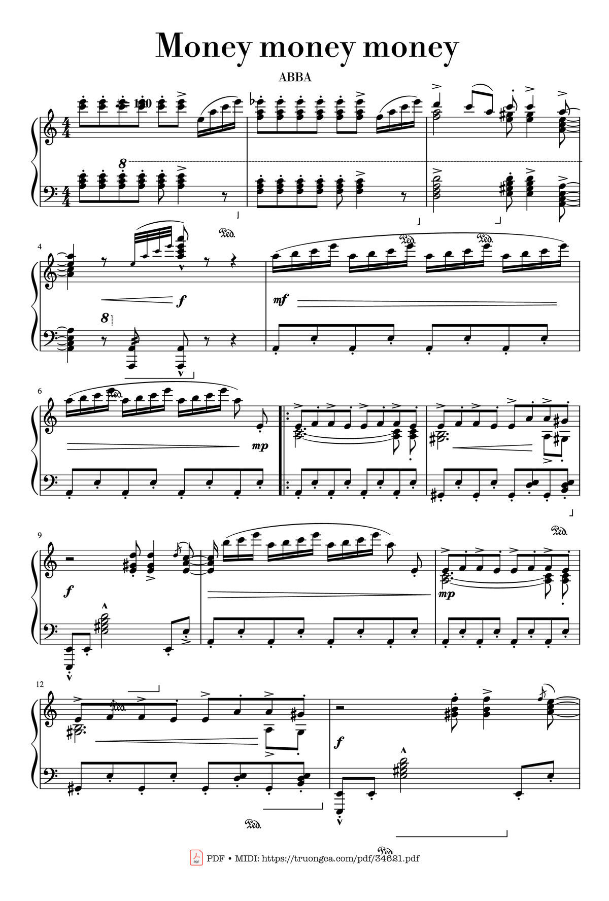 The Videos/audios Money money money Piano by ABBA were embed from Youtube, Musescore or the other 3rd links. Videos are subject to 3rd's copyright control and may be removed by YouTube's copyright rules and 3rd's policies or maybe included advertisements. If you cannot access to these videos/audios, this mean that have been removed.