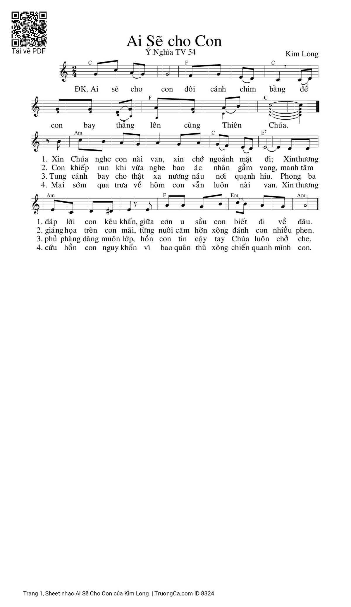 Kim Long ÐK Ai sẽ cho con đôi cánh chim bằng để con bay thẳng lên cùng Thiên Chúa [PDF] [Sheet] [Lyrics] [Mp4/Midi]