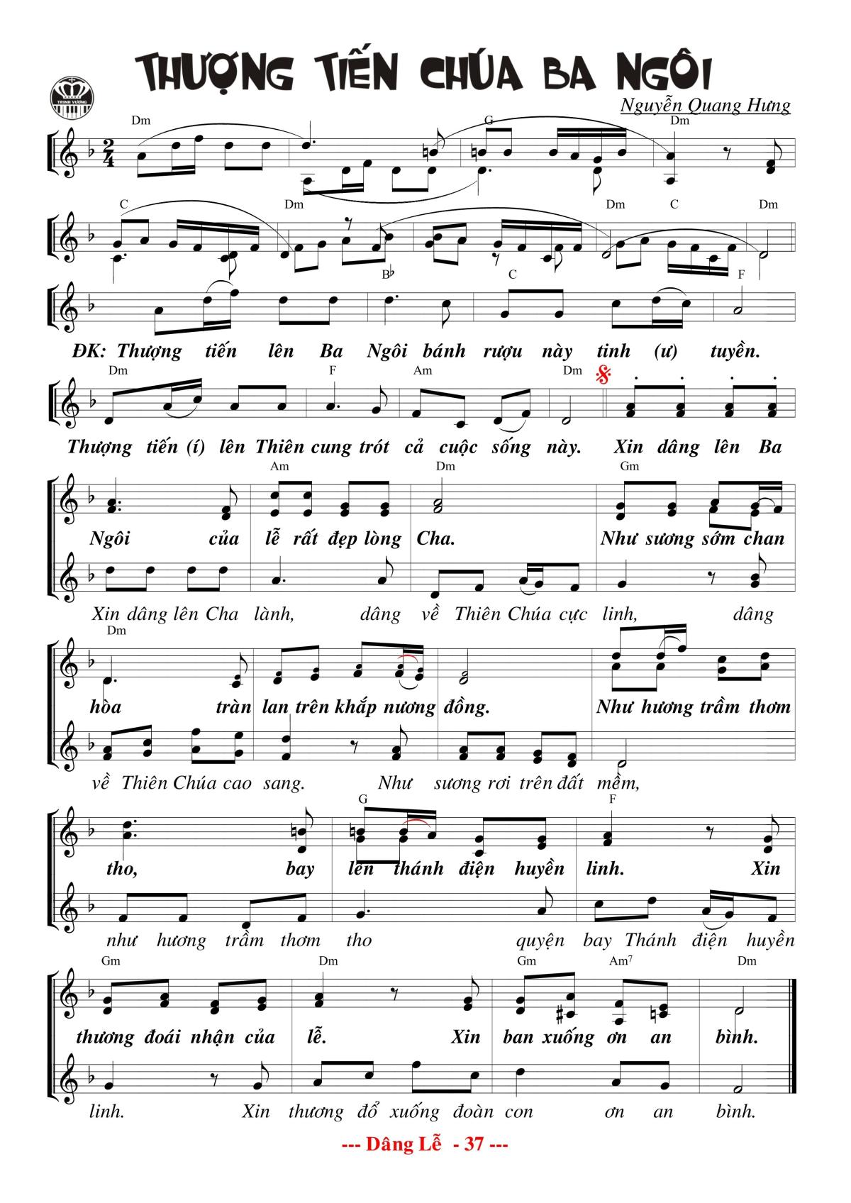 ÐK: Thượng tiến lên Ba Ngôi bánh rượu này tinh tuyền. Thượng tiến lên Ba Ngôi trót cả cuộc sống này. Xin dâng lên Ba Ngôi của lễ rất đẹp lòng Cha, như sương sớm chan hoà tràn lan trên khắp nương đồng. Như trầm hương thơm tho bay lên thánh điện huyền linh. Xin thương đoái nhận của lễ, xin ban xuống ơn an bình.