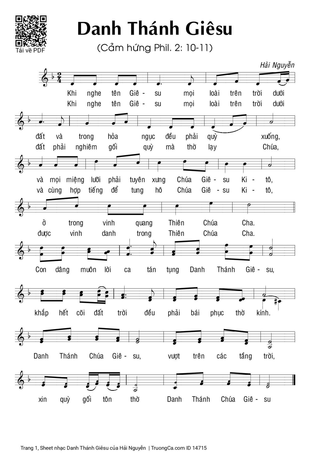 Điệp khúc. Con dâng muôn lời ca tán tụng Danh Thánh Giêsu, khắp hết cõi đất trời đều phải bái phục thờ kính. Danh Thánh Chúa Giêsu vượt trên các tầng trời, xin quỳ gối tôn thờ Danh Thánh Chúa Giêsu