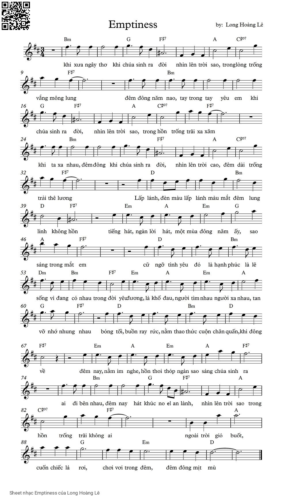 The Videos/audios Emptiness by Long Hoàng Lê were embed from Youtube, Musescore or the other 3rd links. Videos are subject to 3rd's copyright control and may be removed by YouTube's copyright rules and 3rd's policies or maybe included advertisements. If you cannot access to these songs, this mean that have been removed.