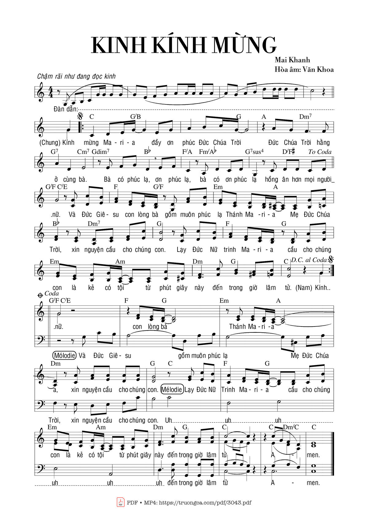 Mai Khanh Kính mừng Maria đầy ơn phúc Đức Chúa Trời [PDF] [Sheet] [Lyrics] [Mp4/Midi]