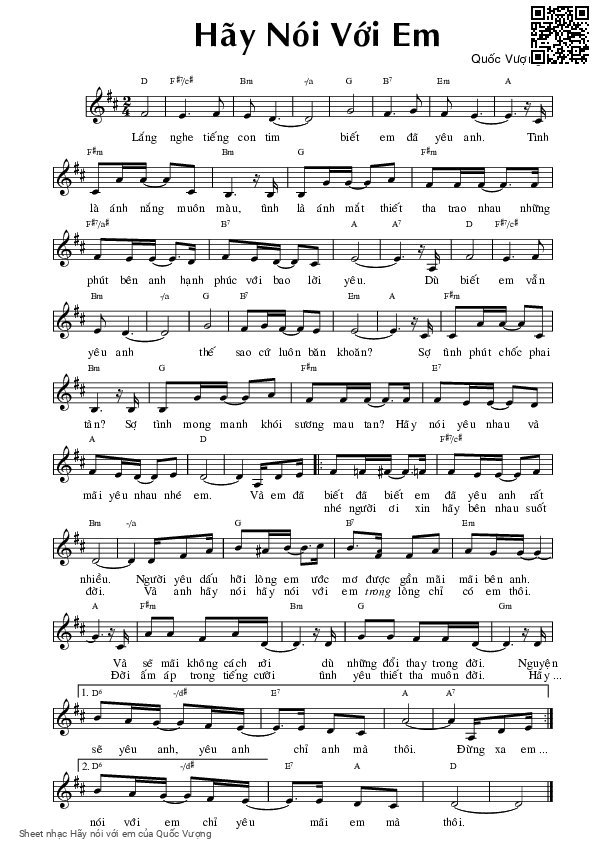 The Videos/audios Hãy nói với em by Quốc Vượng were embed from Youtube, Musescore or the other 3rd links. Videos are subject to 3rd's copyright control and may be removed by YouTube's copyright rules and 3rd's policies or maybe included advertisements. If you cannot access to these songs, this mean that have been removed.