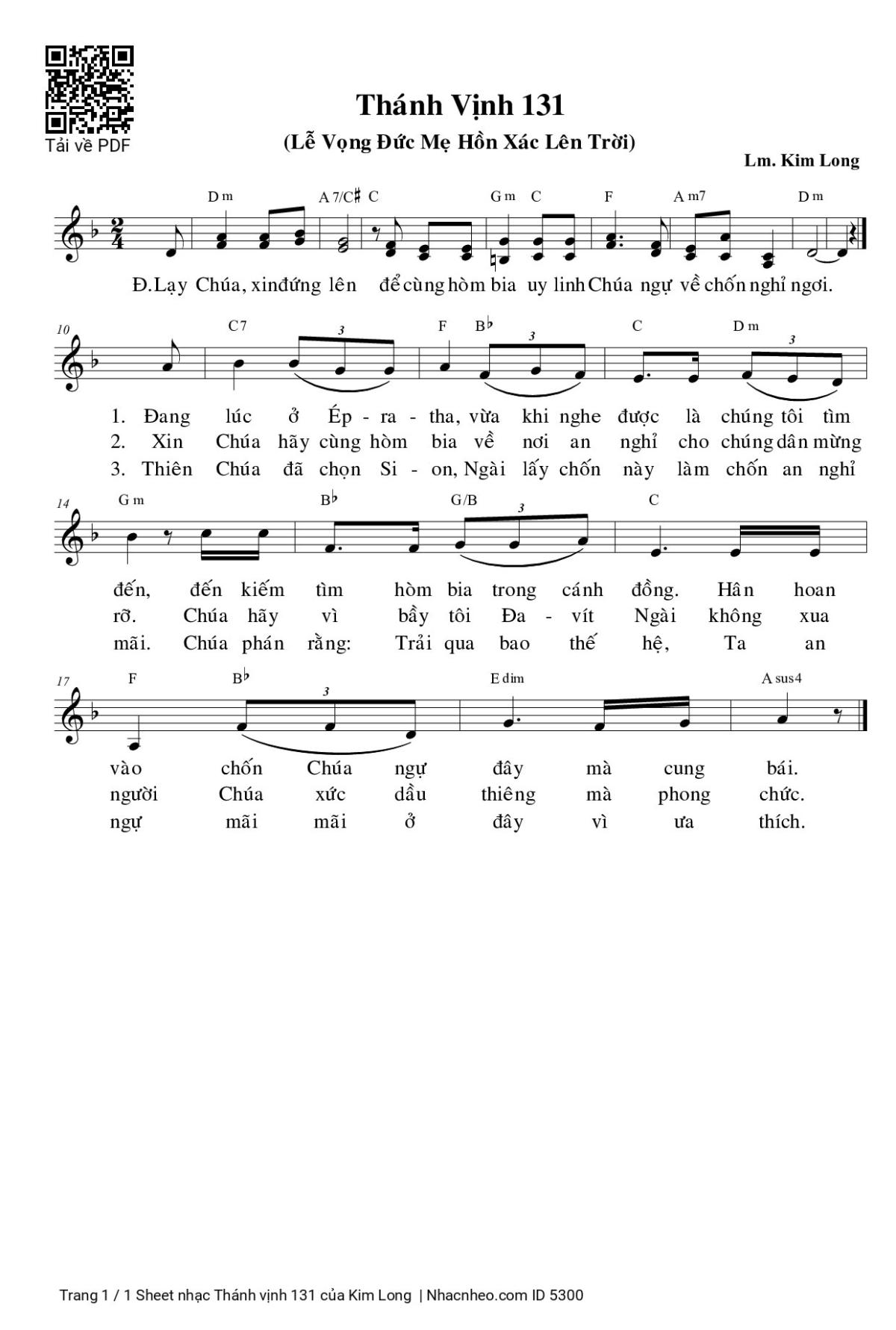 The Videos/audios Thánh vịnh 131 by Kim Long were embed from Youtube, Musescore or the other 3rd links. Videos are subject to 3rd's copyright control and may be removed by YouTube's copyright rules and 3rd's policies or maybe included advertisements. If you cannot access to these songs, this mean that have been removed.