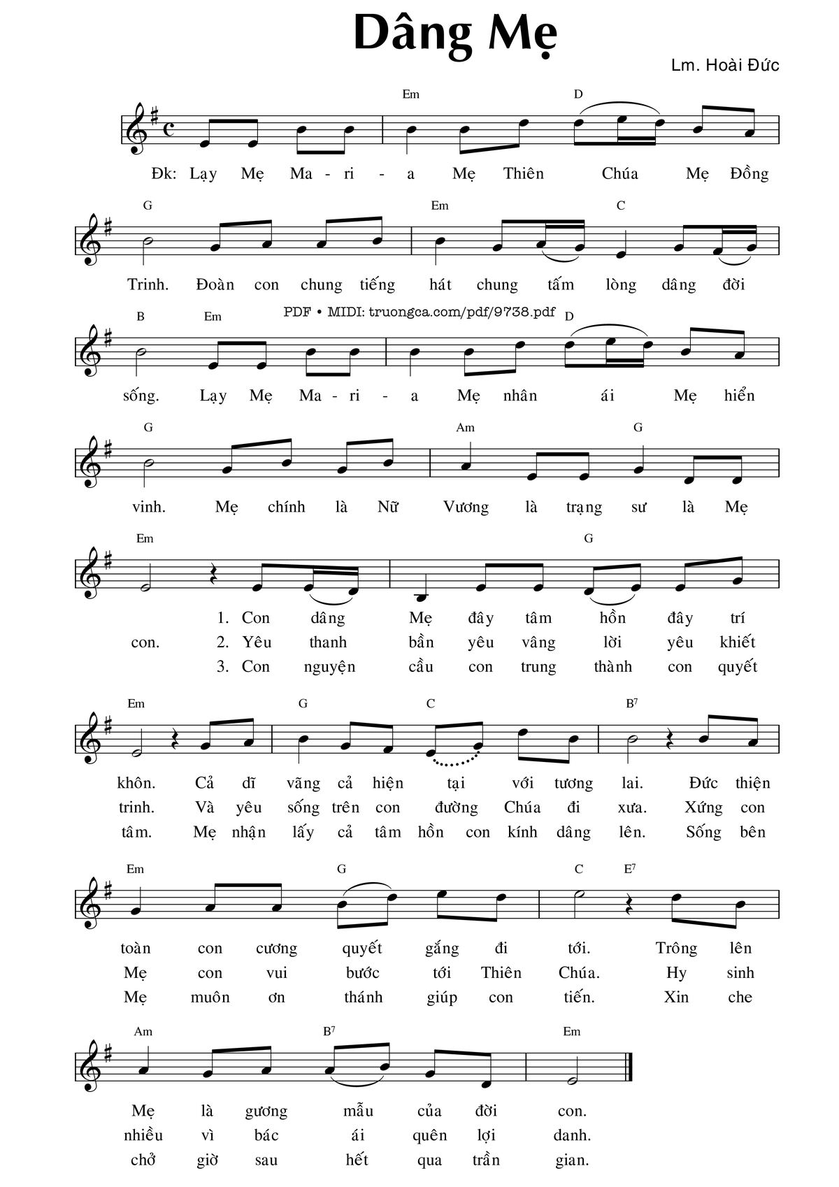 Transposition is the process of moving a song's melody and chords up or down in pitch by a constant interval. The direction of the transposition tool is indicated by a plus (+) sign for up and a minus (-) sign for down. Hover mouse over chords signs to see the chords chart of Dâng Mẹ song.