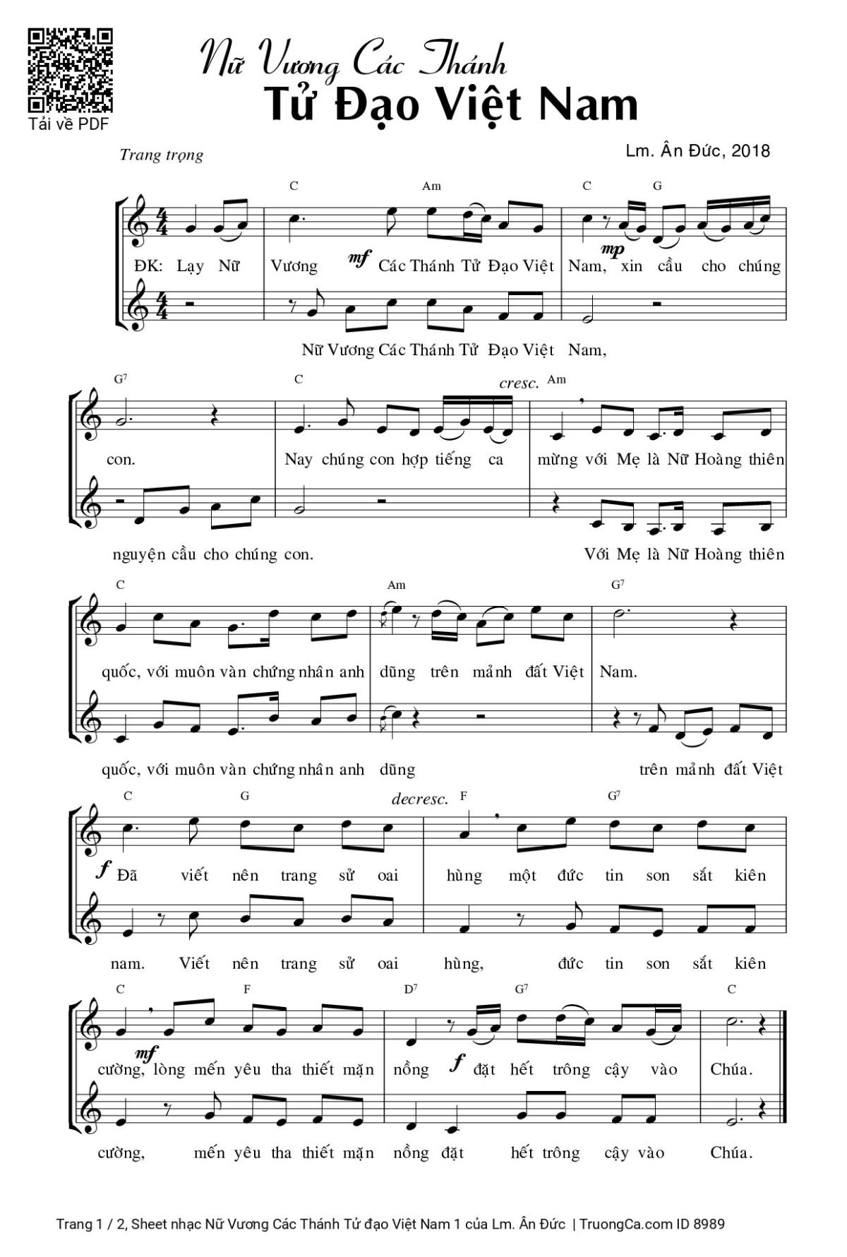 Điệp khúc: Lạy Nữ Vương Các Thánh Tử Đạo Việt Nam, xin cầu cho chúng con. Nay chúng con hợp tiếng ca mừng với Mẹ là Nữ Hoàng thiên quốc, với muôn vàn chứng nhân anh dũng trên mảnh đất Việt Nam. Đã viết nên trang sử oai hùng một đức tin son sắt kiên cường, lòng mến yêu tha thiết mặn nồng đặt hết trông cậy vào Chúa.