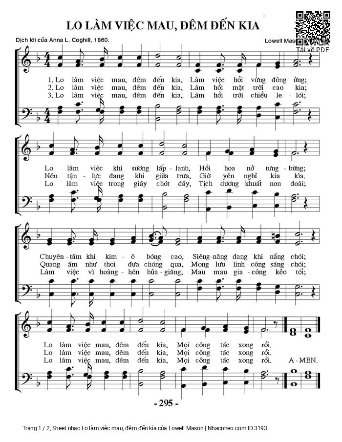 Lowell Mason Lo làm việc mau đêm đến kia [PDF] [Sheet] [Lyrics] [Mp4/Midi]