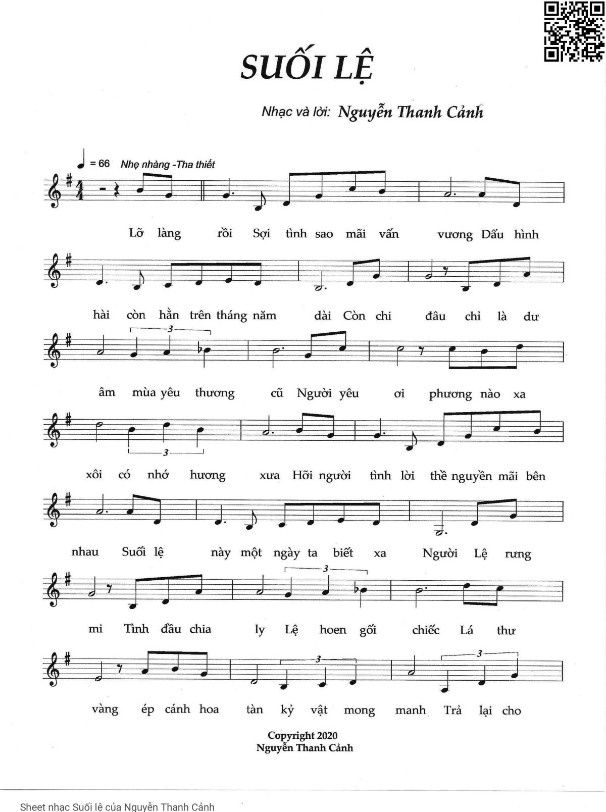 The Videos/audios Suối lệ by Nguyễn Thanh Cảnh were embed from Youtube, Musescore or the other 3rd links. Videos are subject to 3rd's copyright control and may be removed by YouTube's copyright rules and 3rd's policies or maybe included advertisements. If you cannot access to these songs, this mean that have been removed.