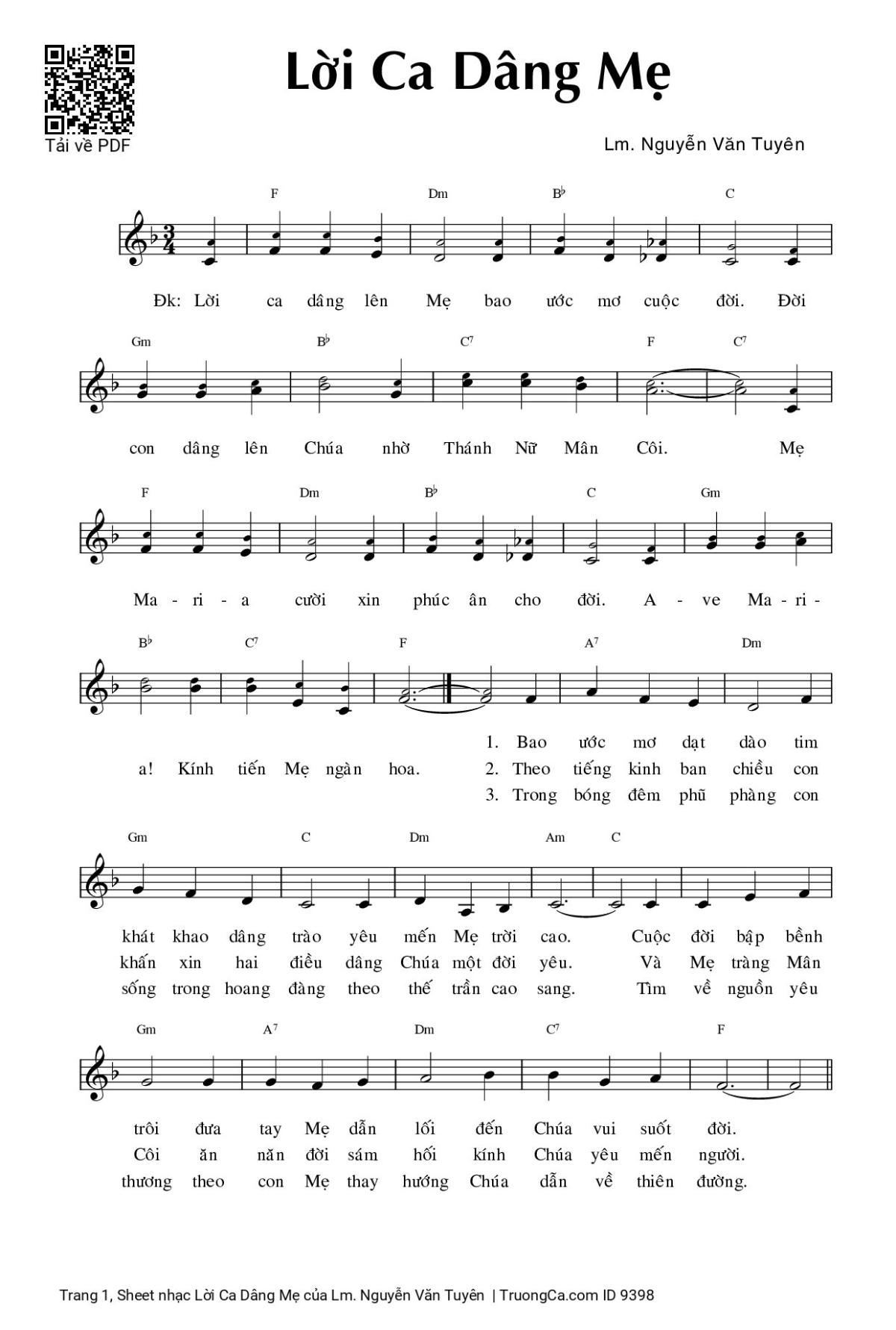Điệp khúc. Lời ca dâng lên Mẹ bao ước mơ cuộc đời. Đời con dâng lên Chúa nhờ Thánh Nữ Mân Côi. Mẹ Ma - ri - a cười xin phúc ân cho đời. A - ve Ma - ri - a! Kính tiến Mẹ ngàn hoa.