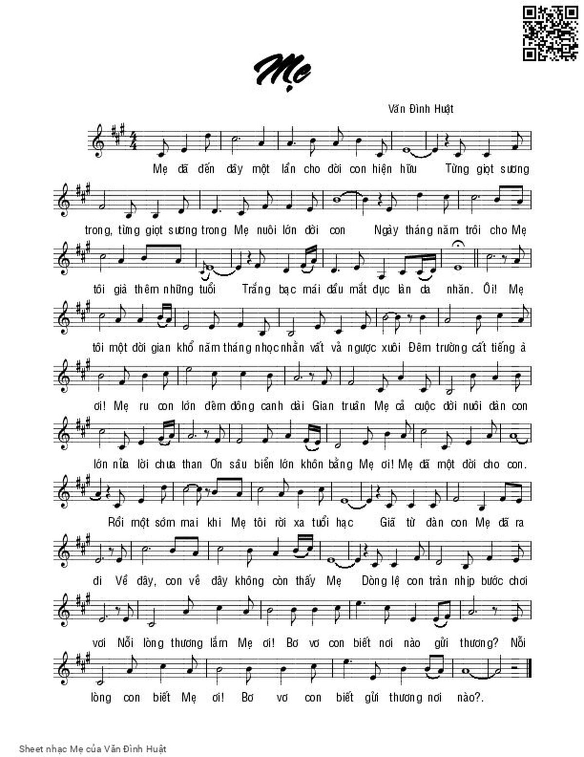 The Videos/audios Mẹ by Văn Đình Huật were embed from Youtube, Musescore or the other 3rd links. Videos are subject to 3rd's copyright control and may be removed by YouTube's copyright rules and 3rd's policies or maybe included advertisements. If you cannot access to these songs, this mean that have been removed.