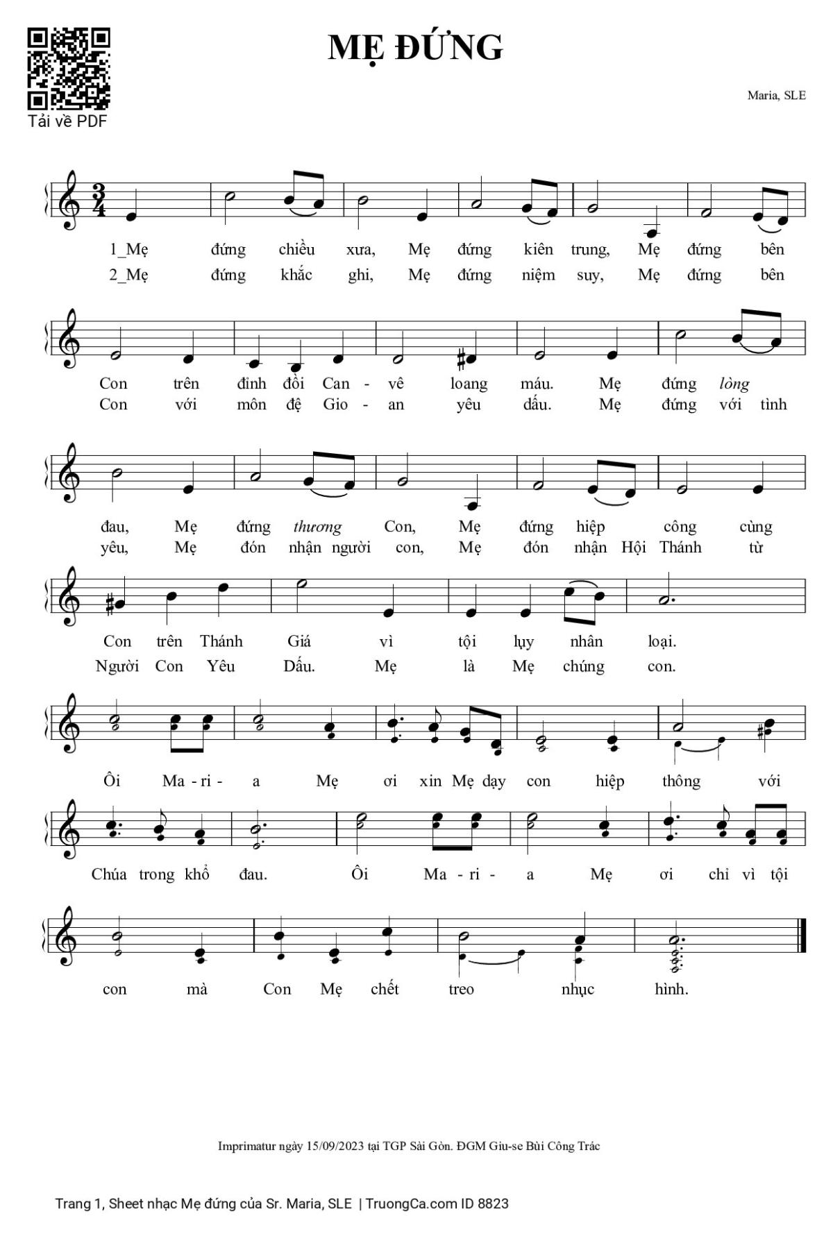 Điệp khúc. Ôi Maria Mẹ ơi xin Mẹ dạy con hiệp thông với Chúa trong khổ đau. Ôi Maria Mẹ ơi chỉ vì tội con mà Con Mẹ chết treo nhục hình.
